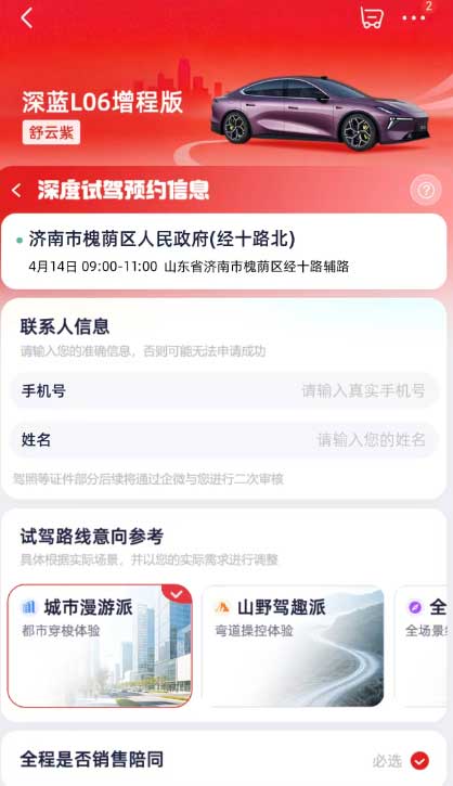 值得注意的是,活动上线第一天仅有“深蓝L06增程版”一款车型可供用户下单试驾,深度试驾服务包括“城市漫游”“山野驾趣”“全能探索”三种场景选择,全天共三个时段可以预约,其中销售陪同属于必选项。对此,有知情人士分析猜测,京东或摒弃传统聚合平台模式,不接入第三方网约车运力,转而深度牵手主机厂,运营“电商+车企”的出行新模式。