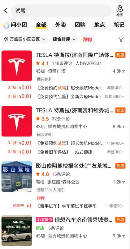 如果你现在打开美团App,搜索“试驾”关键词,仅需花费0.01元即可预约特斯拉、理想、小鹏等品牌线下体验店试驾服务,这意味着,以后顾客可以像刷餐厅、点外卖一样,浏览不同的4S店车型,对比价格和服务,还能在线上下单、发表评价,把平台本地生活的优势完美嫁接到卖车领域。