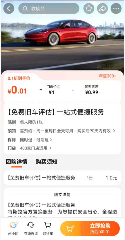 4月13日,记者查询看到,目前在济南地区,特斯拉、理想、小鹏等品牌均在美团上线了0.01元的试驾团购产品,旧车评估等延伸服务同样仅需一分钱即可下单抢购。