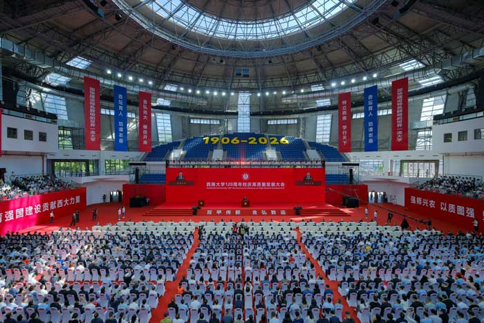 百廿弦歌不辍,含弘笃行致远。4月18日的西南大学,草木葱茏,欣欣向荣。当天上午,西南大学120周年校庆高质量发展大会在学校中心体育馆隆重举行。各级领导、各界嘉宾、国内外高校代表、海内外校友代表、师生员工代表等欢聚一堂,共同庆祝西南大学双甲子华诞。