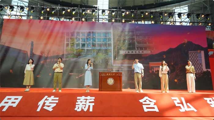 “近六万颗青春的心,今天,站在这里,把最深的敬意与感恩,献给您!”由本科生、硕士生、博士生及留学生组成的学生代表集体献词,向学校致以最真挚的祝福。“薪火相传,我们就是那一束闪耀的光!旗帜所指,我们就是那一面挺立的旗!”铮铮誓言尽显青年一代矢志报国、挺膺奋斗的时代担当。
