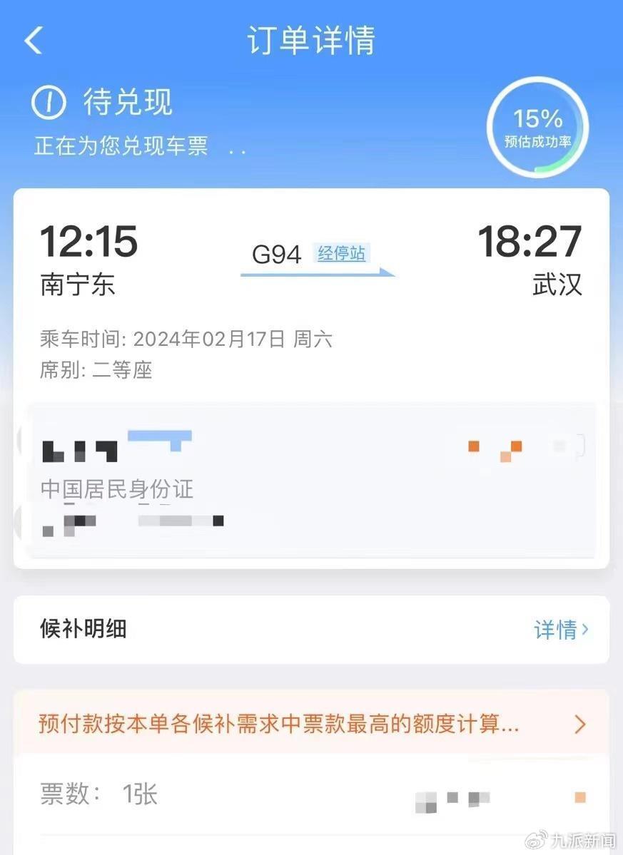 17日,12306全国铁路客服热线称,近几日是春运返程高峰期,车票基本早就售完了,候补车票也很难兑现。客服人员表示,他们只能看到余票数量,无法预测候补成功率。